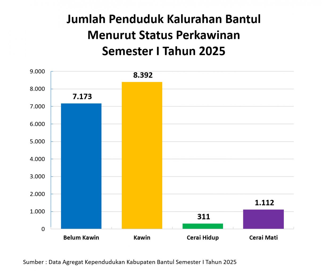 Grafik di atas menyajikan data statistik mengenai komposisi penduduk Kalurahan Bantul berdasarkan status perkawinan pada Semester I Tahun 2025. Berdasarkan data tersebut, kategori penduduk dengan status kawin merupakan jumlah terbesar yang mencapai 8.392 jiwa, disusul oleh penduduk yang belum kawin sebanyak 7.173 jiwa. Selain itu, tercatat pula jumlah penduduk dengan status cerai hidup sebanyak 311 jiwa serta cerai mati sebanyak 1.112 jiwa.