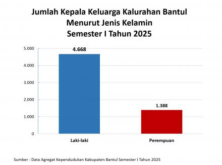 Grafik di atas menyajikan data statistik mengenai jumlah Kepala Keluarga (KK) di wilayah Kalurahan Bantul berdasarkan Data Agregat Kependudukan Semester I Tahun 2025. Tercatat total terdapat 6.056 Kepala Keluarga yang terdiri dari 4.668 Kepala Keluarga laki-laki dan 1.388 Kepala Keluarga perempuan.